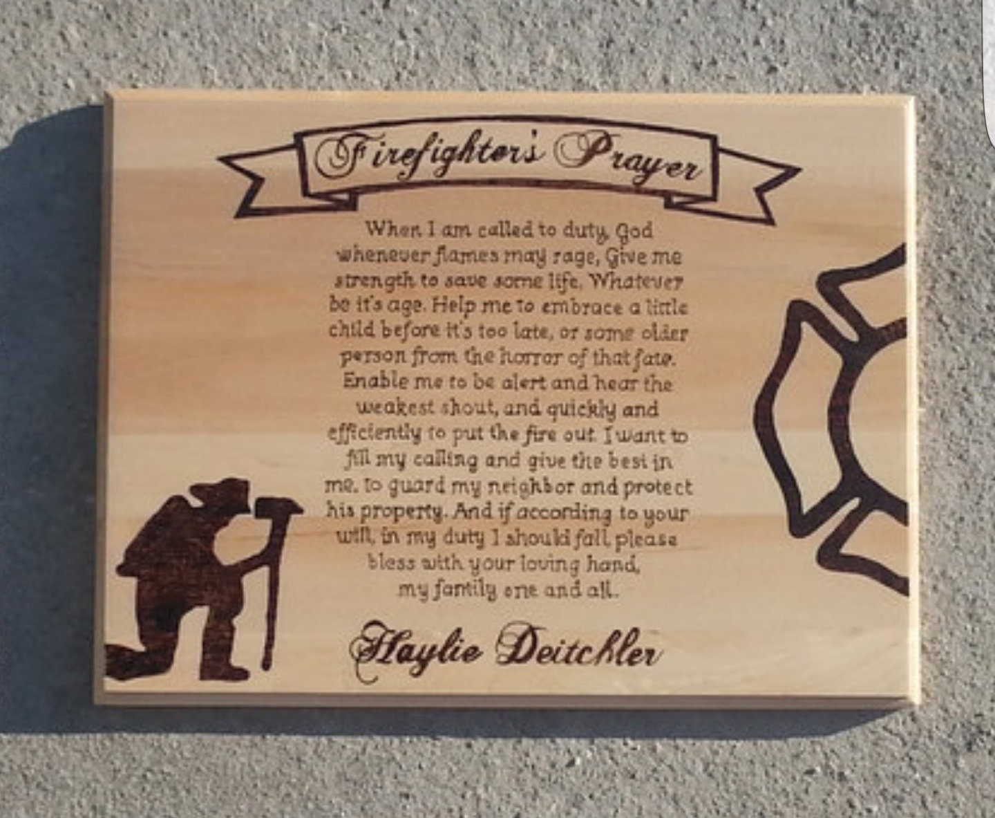 "When I am called to duty, God whenever flame may rage, Give me strength to save some life, Whatever be it's age. Help me to embrace a little child before it's too late, or some older person from the horror of that fate. Enable me to be alert and hear the weakest shout, and quickly and efficiently to put the fire out. I want to fill my calling and give the best in me, to guard my neighbor and protect his property. And if according to your will, in my duty I should fall, please bless with your loving hand, my family one and all."