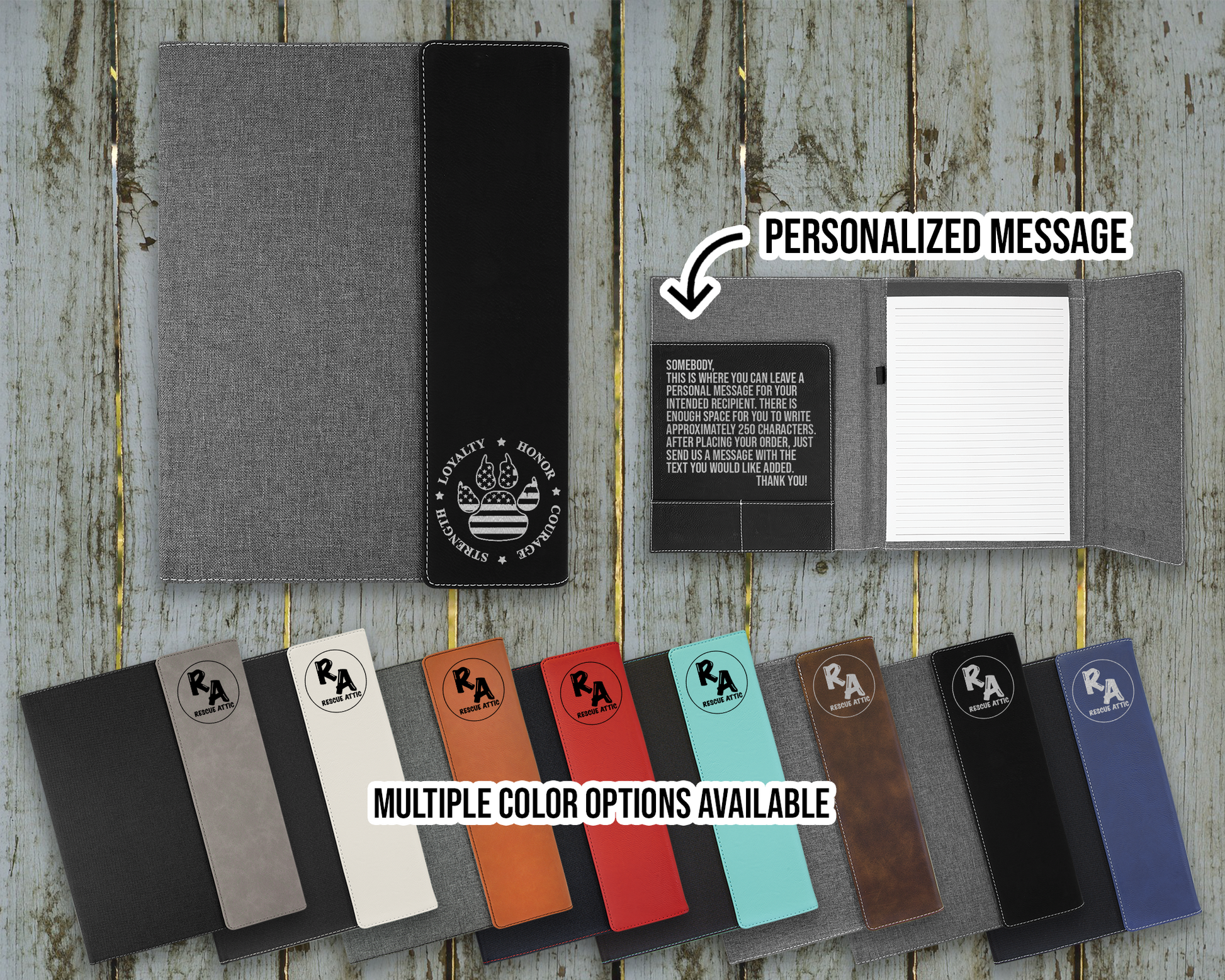 **** CUSTOMIZATION **** If you chose to have engraving done on the inside of the portfolio, you can email your details to us via email at rescueattic@gmail.com . Please make sure to specify which information is being placed where on your notebook. A mockup WILL be sent to you for approval prior to production.