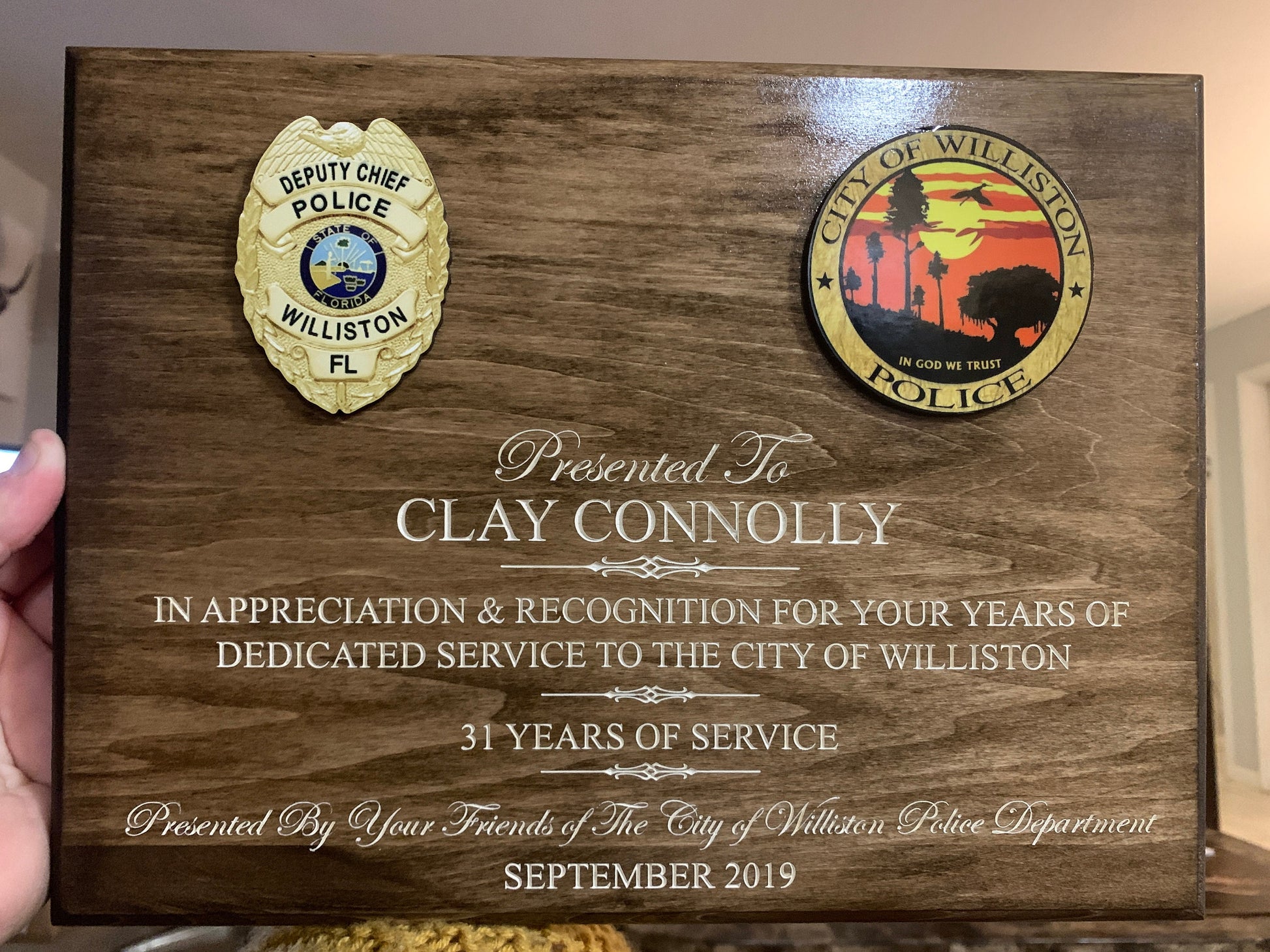 This retirement gift is an excellent way to showcase your appreciation for a fellow first responder. The wording is laser engraved and painted into the wood to give it a touch of elegance. We use a high quality printing method to create the badges and seal, and then securely attach them to the plaque.