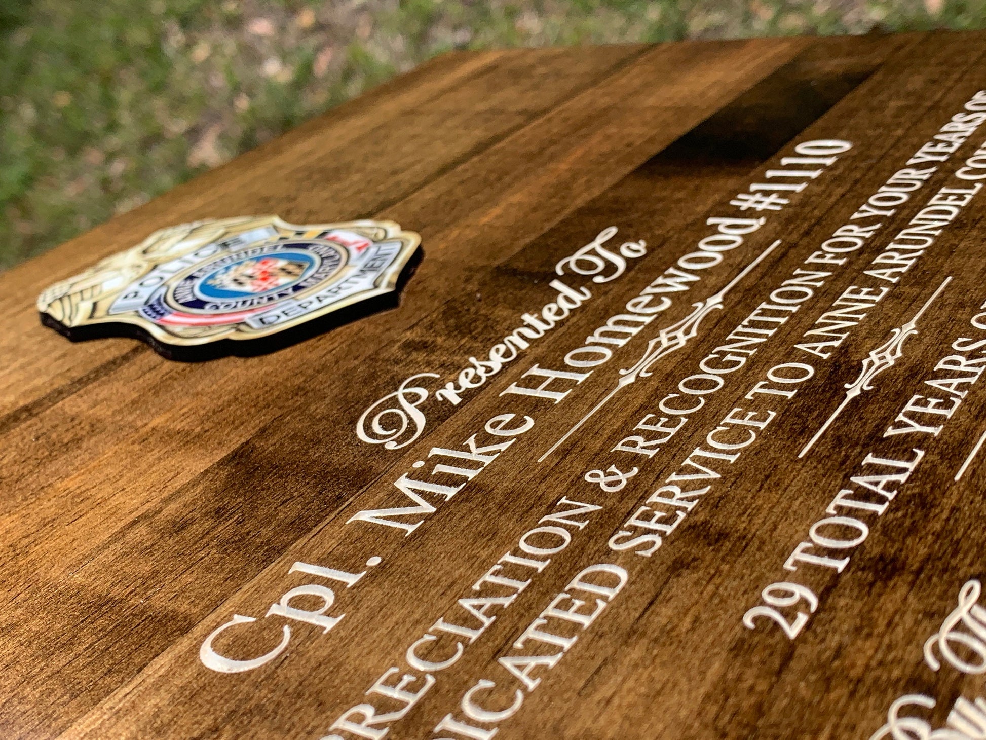 This retirement gift is an excellent way to showcase your appreciation for a fellow first responder. The wording is laser engraved and painted into the wood to give it a touch of elegance. We use a high quality printing method to create the badge or seal, and then securely attach it to the plaque.