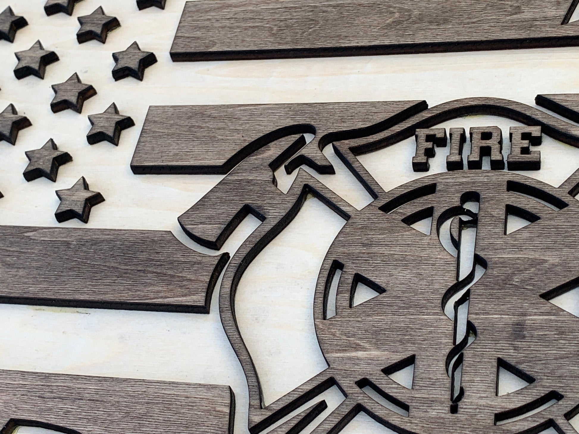 US Flag shaped like the United States outline. In the middle, a Maltese cross representing Fire & EMS is placed. Raised pieces are stained to give a contrasting look. Decor piece is coated with a clear coat for protection. Maltese cross can be changed out for another emblem, but please message us prior to placing your order to confirm.